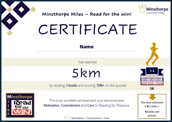 Y7 Students are invited to take part in the reading challenge ‘Minsthorpe Miles’.  To begin your race, choose a quizzable book to read. Once complete, have a go at the 10 question, multiple choice quiz.  Score 7 or more and you are in the race.  The more reading and quizzes you complete, the more certificates and prizes you will receive.
