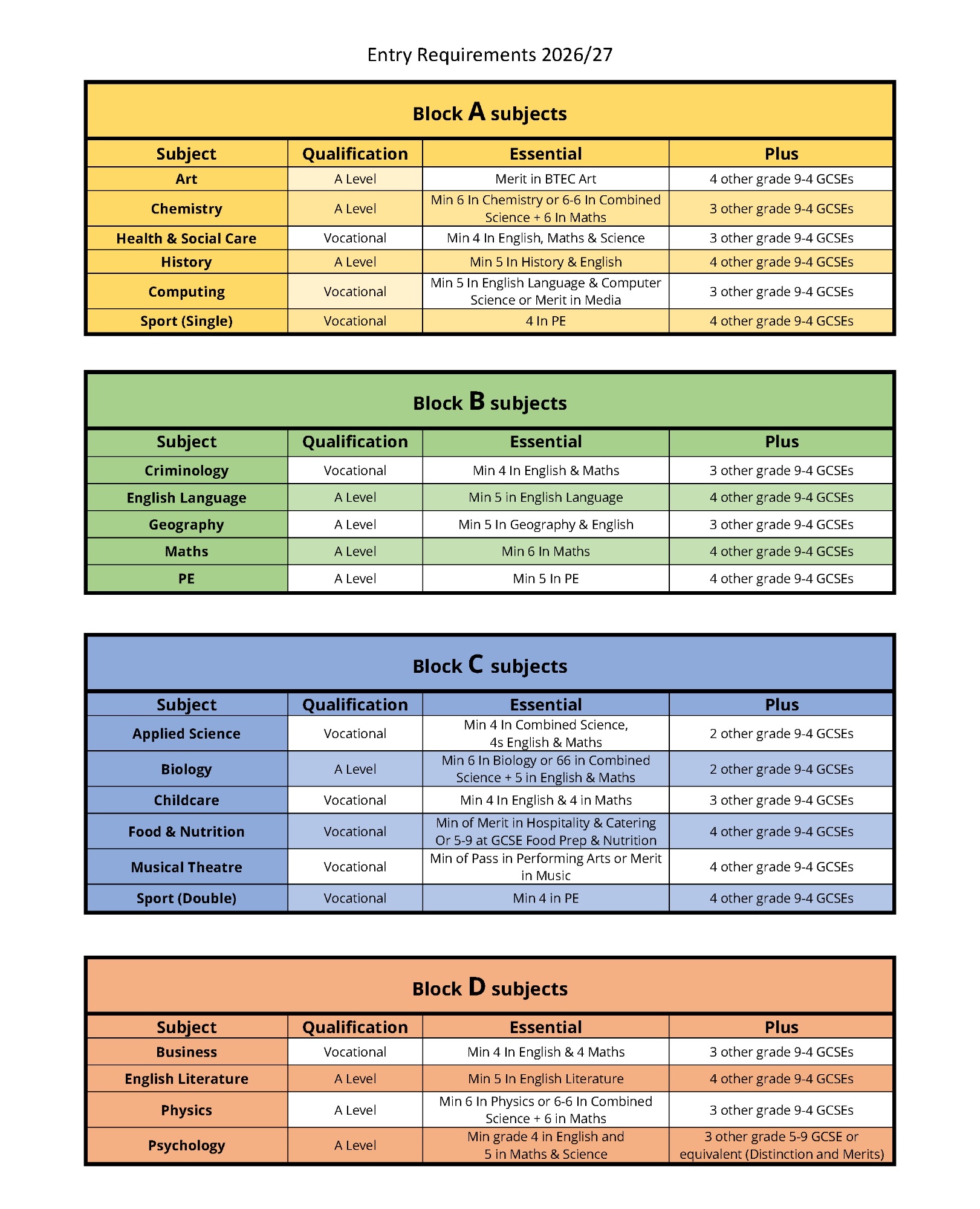 Please see below the current subjects available and the requirements for them. Students need to pick three subjects from three different blocks.